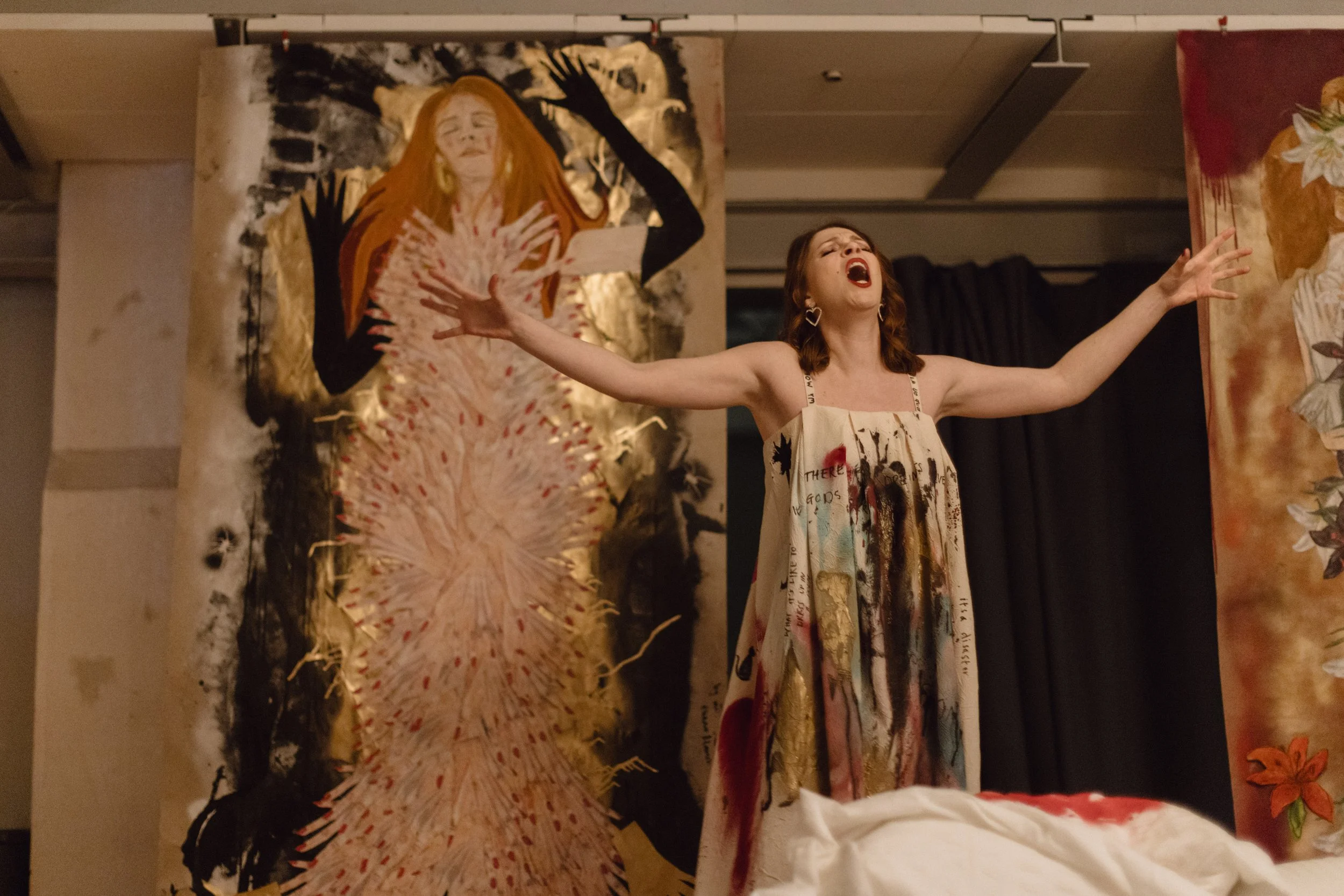 Shopping for God, a poetry operetta, was written and performed by Eleanor Flowers and first staged at Hos Arne Gallery in Oslo in February 2024. The work was an exploration of hyper-consumerism, Jungian theories of metanoia and self-realisation, and feminist theology.